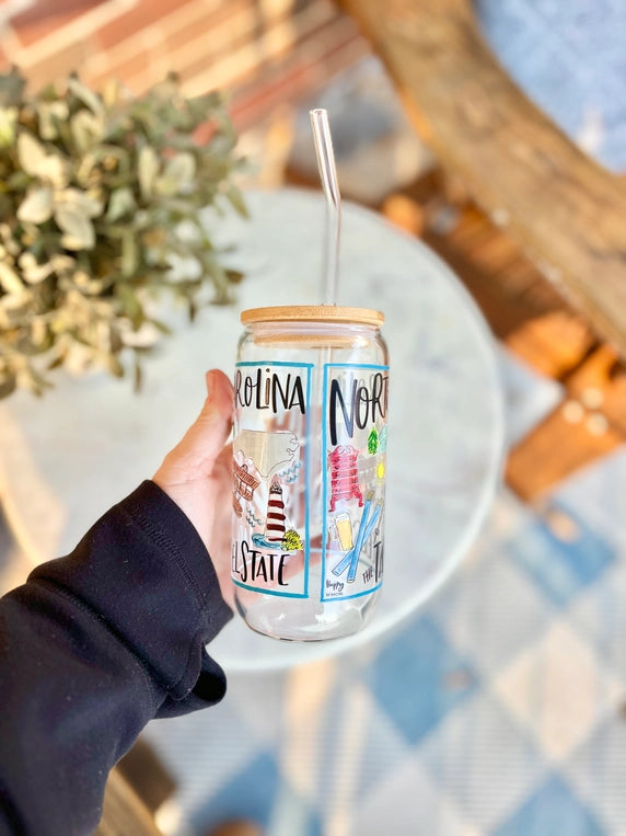 Calling all the iced coffee girlies! Drink from the cutest glassware around! Makes the perfect drinking glass souvenir! All artwork is original hand painted and has iconic things representing the state of NORTH CAROLINA! Comes with a glass straw and bamboo lid!