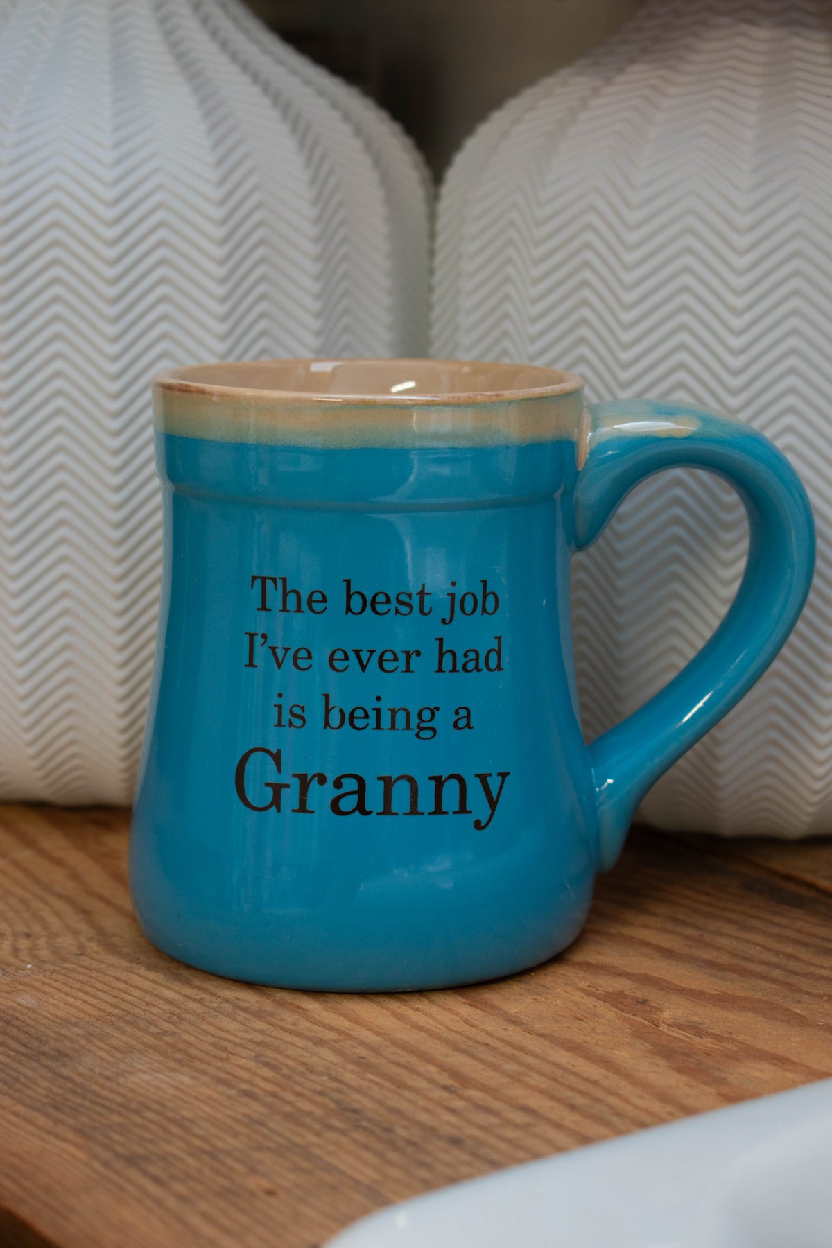 18 oz Light Blue mug with "Granny" on one side and "The best job I've ever had is being a Grammy" on the other. Individually gift boxed.