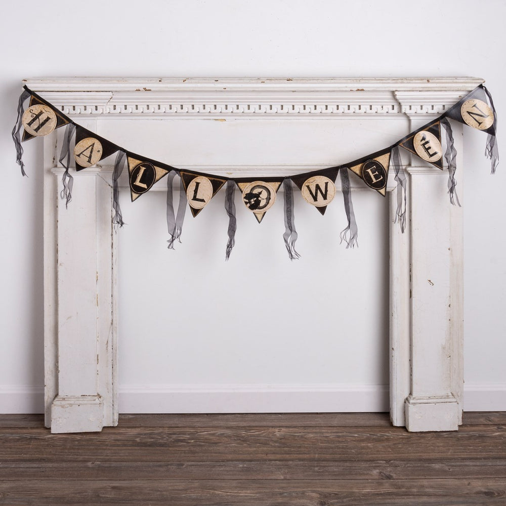 The perfect party accessory, a pennant banner for the holidays featuring dimensional accents on each flag, "Halloween" sentiment, and strips of fabric throughout to add movement and texture. Complements well with coordinating styles for a cohesive collection.